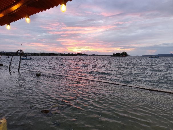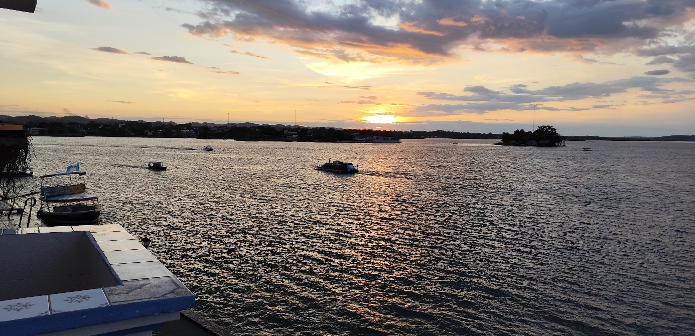 Das Highlight unseres Hotels ist eine Roof Top Bar mit tollem Blick über den Petén-Itzá-See. Bei einem kühlen Bier genießen wir den Sonnenuntergang.