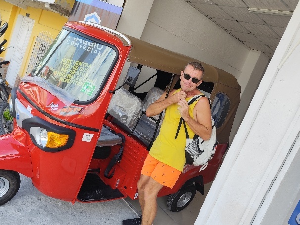 Auf dem Weg zurück endecken wir noch einen Tucktuck Händler, umgerehnet 4000 EUR kostet ein Neues. Waren und Dekoration hängen überall auf „Mayahöhe“, wir müssen ständig den Kopf einziehen.