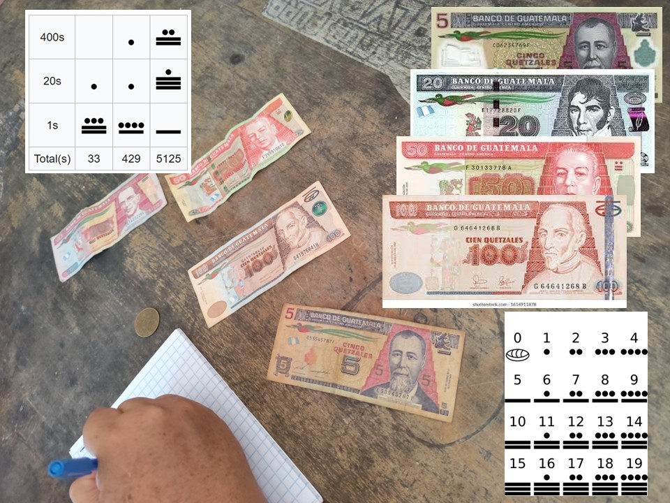 Bis heute findet man den Wert sich auf den Geldscheinen in Guatemala auch in Maya Schreibweise. Viel Spaß beim Nachrechnen.