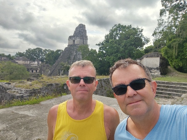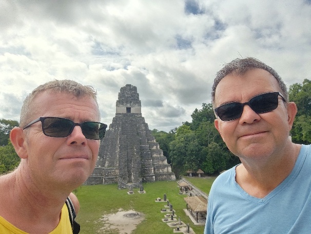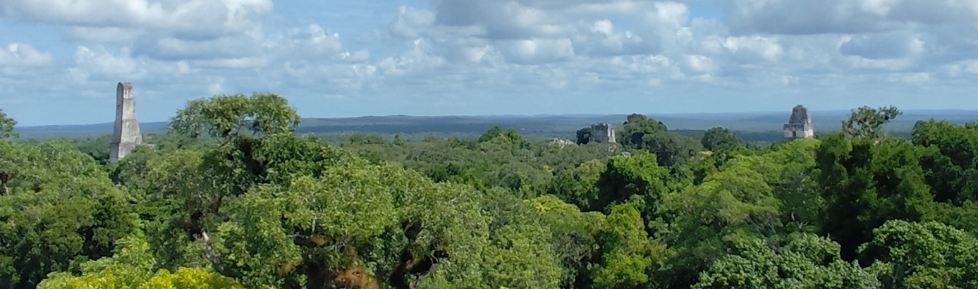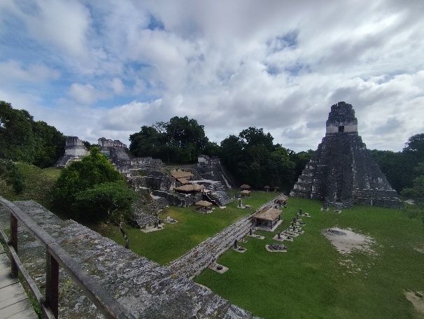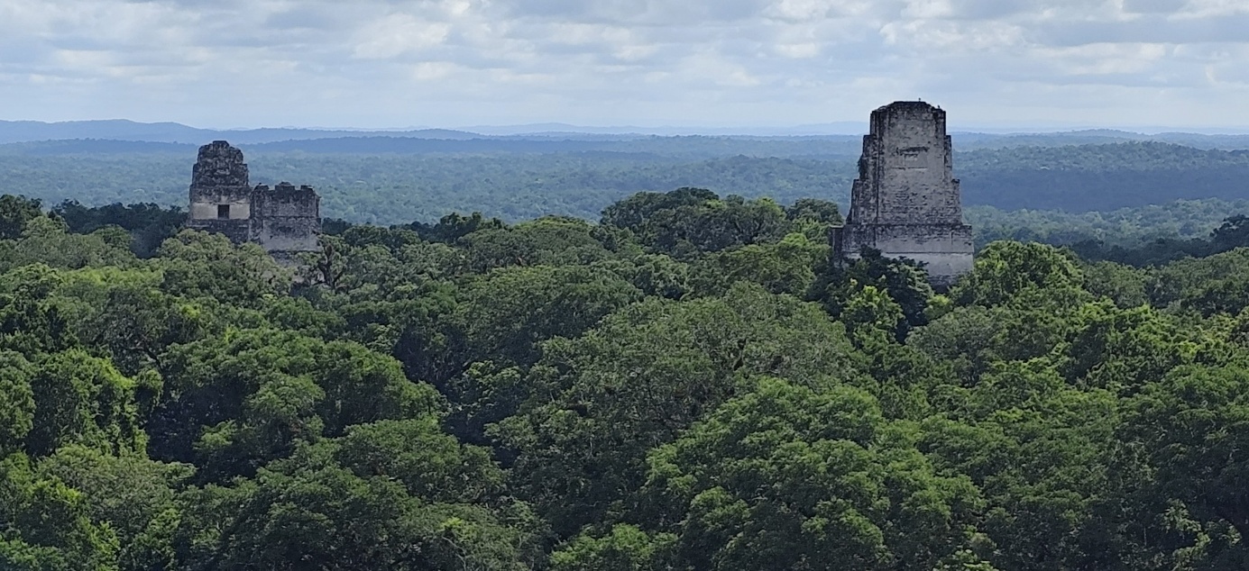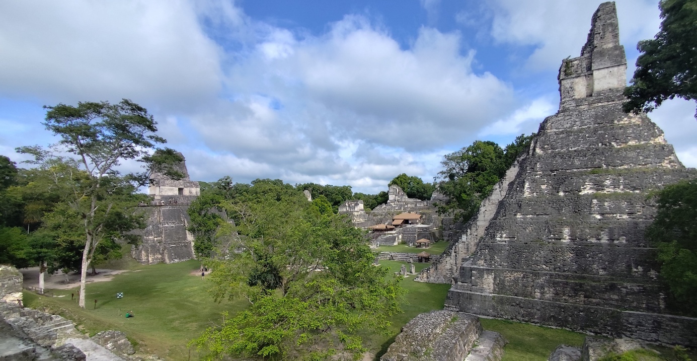 Auch Tempel 4 ist vor uns nicht sicher. Cooler Blick auf Tempel 1,2 und 3. Heute schauen die Tempelspitzen aus dem Dschungel heraus. Zu Zeiten der Mayas gab es hier keine Bäume, die gesamte Fläche was schier.