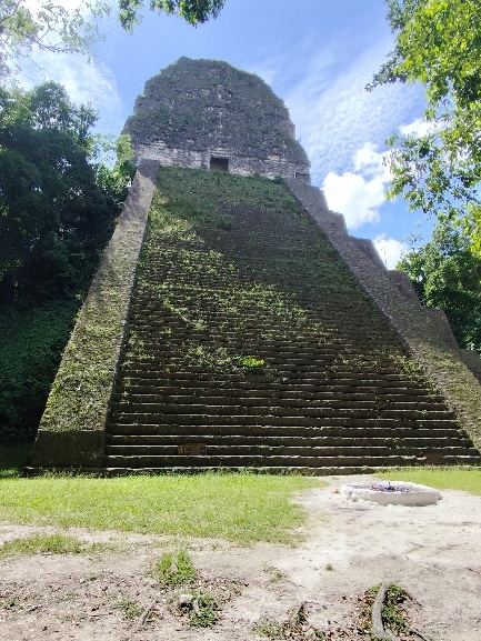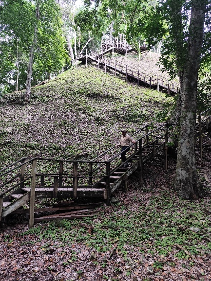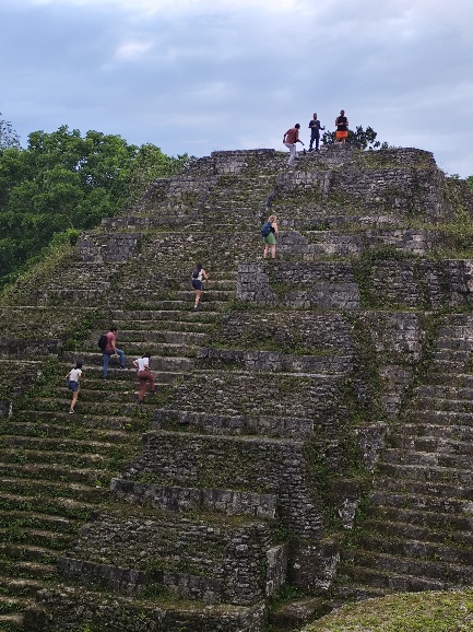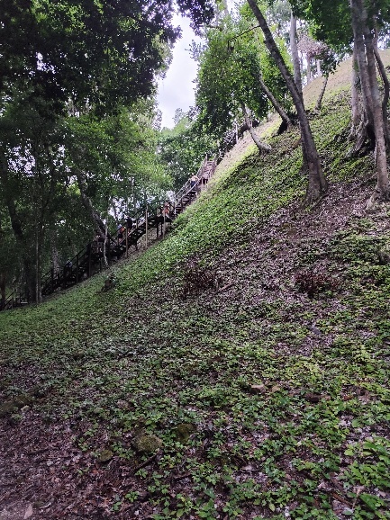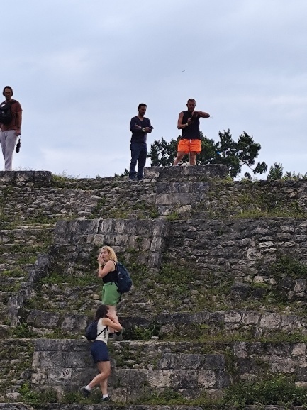 Wir verstehen, warum Yaxha weniger bekannt ist. Nichtsdestotrotz erklimmen wir die die Treppen eines Berges um die Spitze eines Maja Tempels zu sehen.