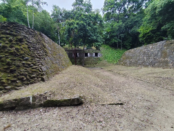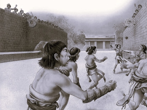 Wir kommen zum Ballspielplatz. Beim „Juego de Pelota“ traten zwei Mannschaften mit je bis zu sieben Spielern gegeneinander an: Ziel war es, einen zwei bis vier Kilo schweren Kautschukball in das Feld des Gegners zu treiben und dabei möglichst selten auf dem Boden aufkommen zu lassen. Die Sportler durften den Ball jeweils nur mit zwei Körperteilen spielen, etwa mit der Schulter und der Hüfte; werfen und schießen waren verboten.