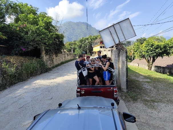 Während der Fahrt zum Semuc Champey können wir die Landschaft genießen. Die Straßen sind in guter Qualität, so dass hinten auf dem Pickup gut auszuhalten ist. Kurz vorm Ziel gibt es einen kurzen Stopp. Diejenigen, die keine Wasserschuhe mitgebracht haben, können sich hier welche, gegen Gebühr, leihen. Später werden sie wieder eingesammelt. Wir haben unseren eigenen im Rucksack.