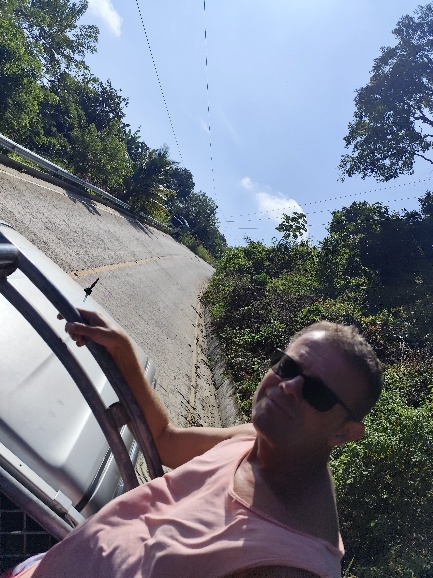 Nach etwas über 3,5 Stunden meldet sich bei einem Mitfahrer ein menschliches Bedürfnis. Der Busfahrer stellt eine Pause in etwa 45 min. in Aussicht. So lange reicht es nicht mehr. Da der Fahrer nicht anhält, wird eben bei fahrendem Bus aus dem Fenster gepinkelt. In der Pause 45 min. später geht dann jeder 2-mal auf Toilette. Bis Lanquin wird es keinen weiteren Halt geben. Nach 9,5 Stunden erreichen wir um 17:30h die Bushaltestelle in Lanquin und werden Hotelweise in Gruppen eingeteilt. Mit Pickups erreichen wir auf der Ladefläche stehend wenige Minuten später unser Hotel.