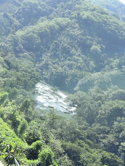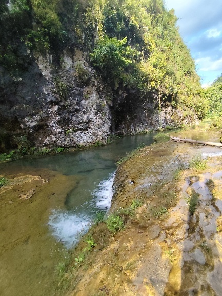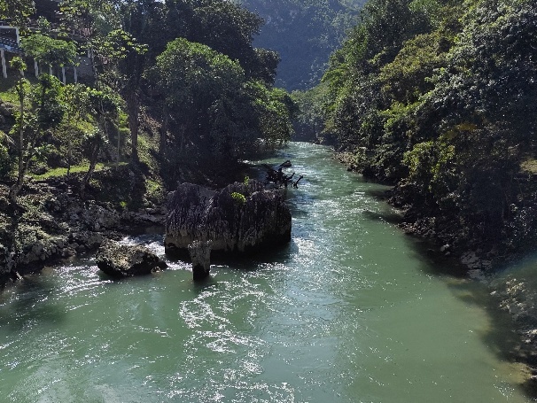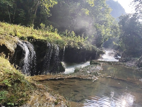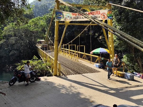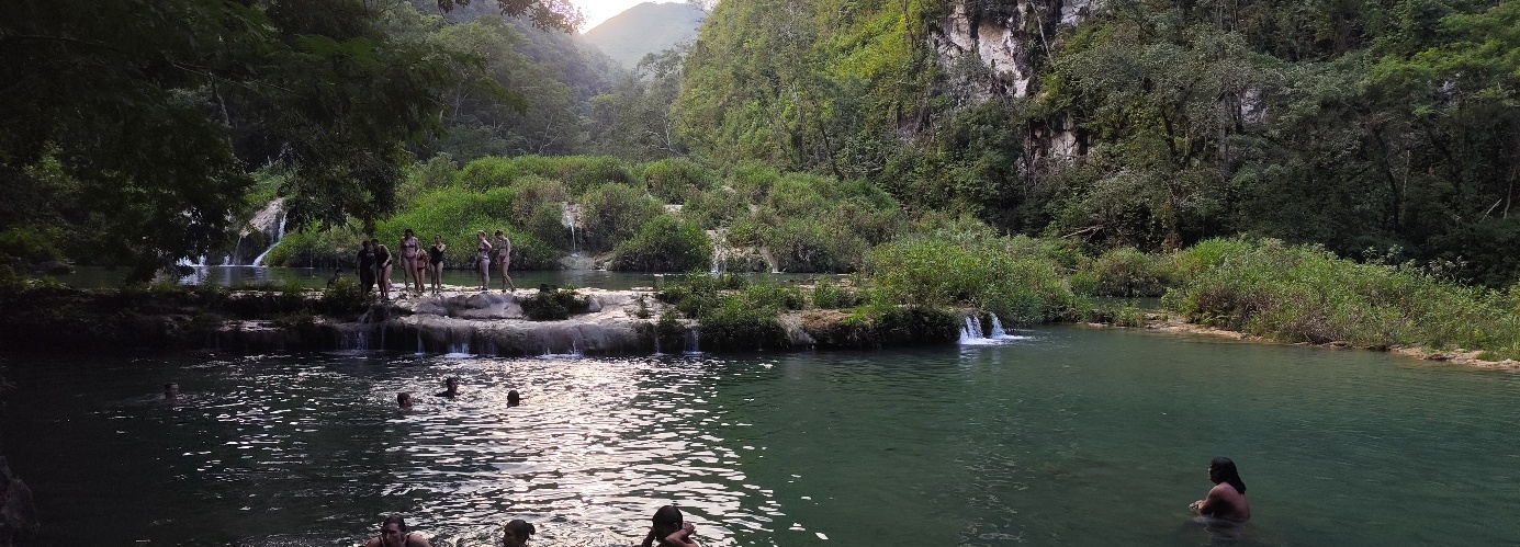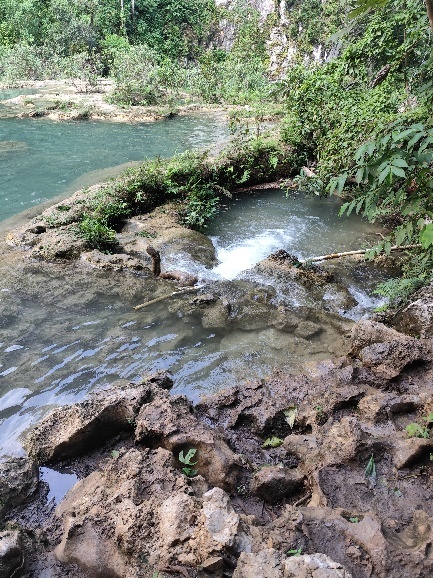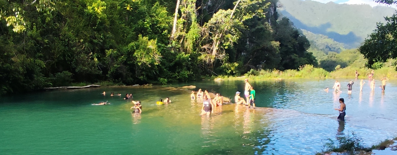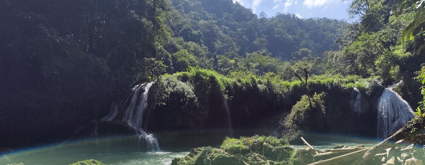 Oberhalb der Wasserfälle liegt Semuc Champey, die eigentliche Touristen Attraktion der Gegend. Der Río Cahabón, der unter den Becken des Semuc Champey fließt, vereint sich hier wieder mit dem Wasser aus den Becken an der Oberfläche.