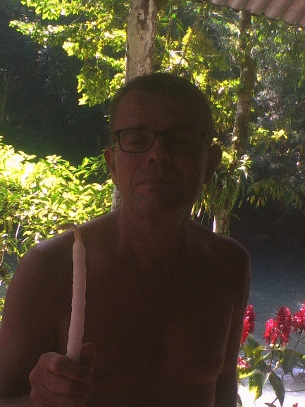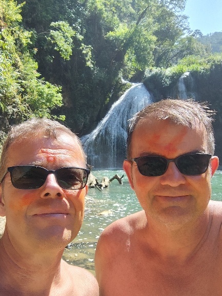 Wer möchte, kann aus ca. 12m Höhe in den Fluss springen. Unserem Guide ist das zu langweilig, er legt noch ein paar Meter drauf, indem er auf den Baum klettert und von dort springt. Ein paar Reste der Maya Kriegsbemalung, die wir vor Betreten der Höhlen bekommen haben ist noch zu sehen