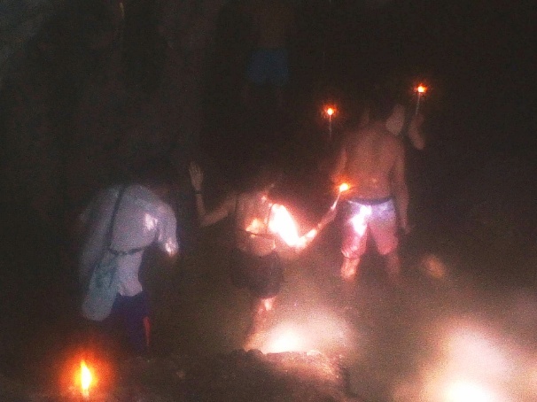 Bevor wir aber zu Semuc Champey kommen, werden wir zunächst die Kanba Höhlen erforschen. Diese haben keinerlei Beleuchtung und nur mit Kerzen bewaffnet machen wir uns auf den Weg. Nur unsere Guides haben eine Kopflampe. Während der Tour schwimmen, rutschen, klettern und wandern wir durch felsige Gänge, unterirdische Seen und Wasserfälle. Für Fotos ist es zu dunkel, da die Kerze immer in den Focus der Kamera rückt und quasi keine Belichtung möglich ist.