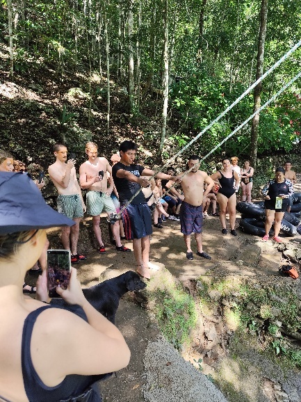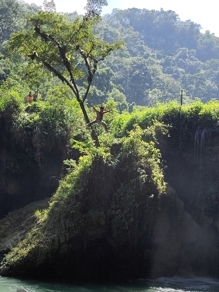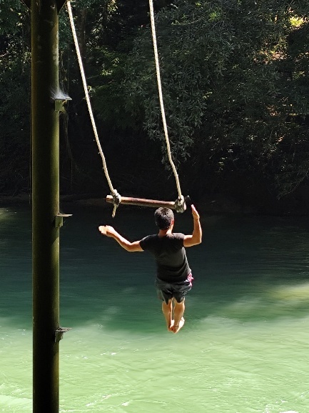 Nächster Punkt unserer Tour – Springen ins Wasser von der Schaukel- Unser Guide zeigt uns wie es geht. Nachdem alle die wollten gesprungen sind geht es zum Wasserfall am Semuc Champey.