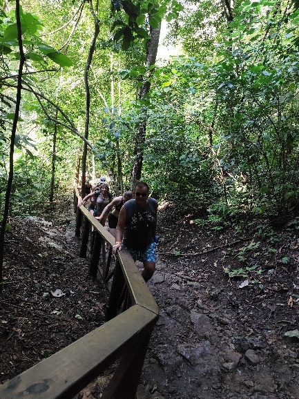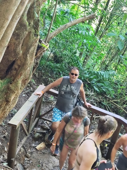 Das nächste Highlight unserer Tour ist ein Aussichtspunkt, von dem man eine coole Sicht auf den Semuc Champey hat. 500m war die Ansage des Guides. Überwiegend steile Treppen mit mehr als 45° Steigung und Stufenhöhen so um die 40cm. Da braucht der Tom zwischendurch ne Pause. Aber wir kommen oben an.