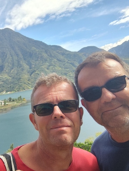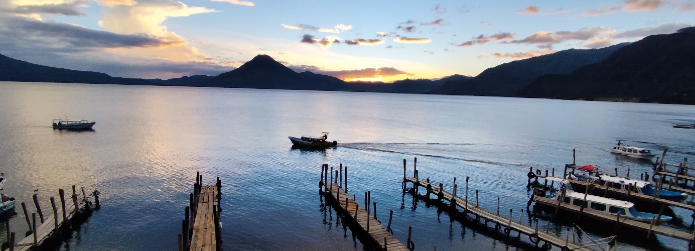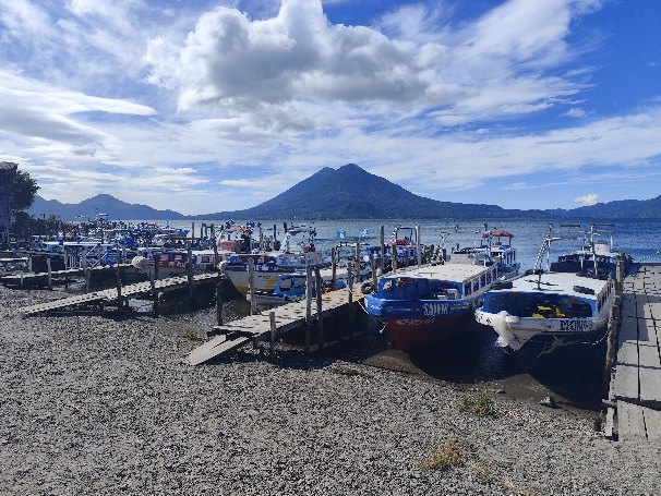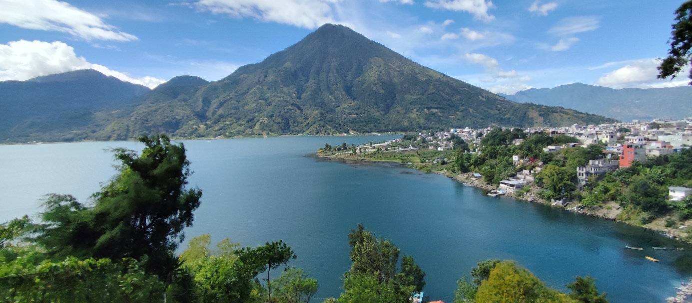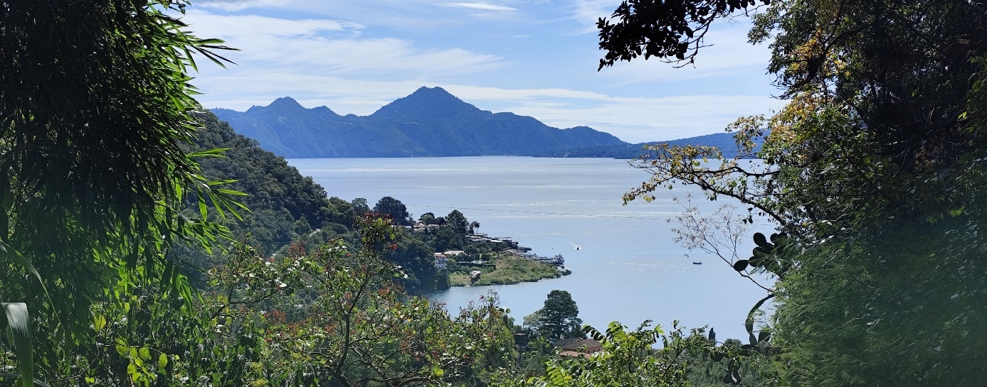 Wir genießen den Blick über den See beim Abendessen. Der See liegt in einem Krater, der vor ungefähr 84.000 Jahren durch die Explosion eines sehr großen Supervulkans entstand. Im Laufe der Zeit ist der Wasserspiegel des Sees angestiegen, da das Tal keinen natürlichen Abfluss hat. Der tiefste Punkt des alten Kraterrandes befindet sich im Südosten bei San Lucas Tolimán