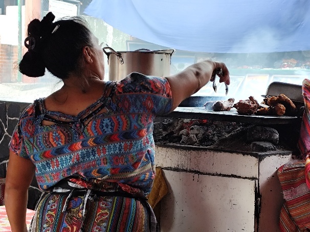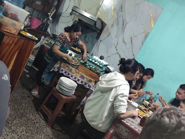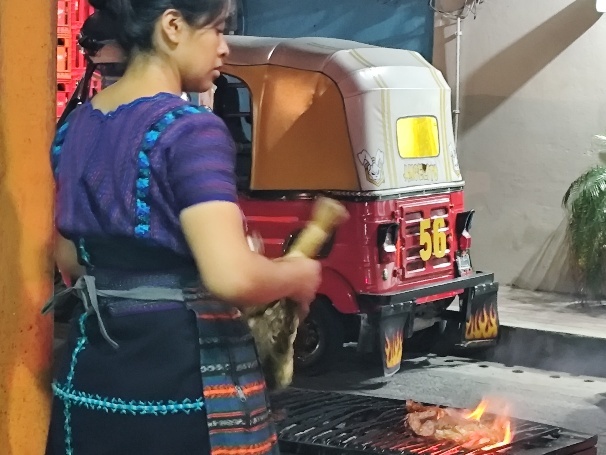 Heute gibt es gerilltes Schwein oder Huhn mit Pommes und Salat oder klassisch mit Ei, Reis und Bohnen. Während vor der Tür gerillt wird, wird in der Miniküche der Rest zubereitet. Gegessen wird im gleichen Raum. Unsere Biere müssen noch schnell im Nachbarshop organisiert werden. Lecker ist das Essen und preiswert. Für 2 Abendessen mit Bier zahlen wir 110 Q, umgerechnet etwa 12 EUR. Am nächsten Abend werden wir hier wieder essen.