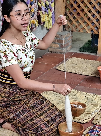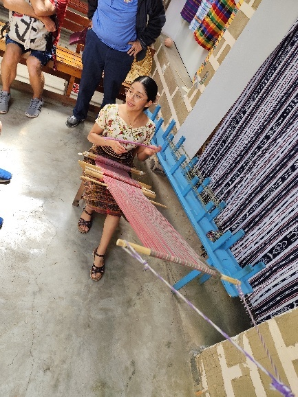 Mit größtem Interesse verfolgen wir dann, wie aus Baumwolle Fäden gezogen und diese im Weiteren gefärbt und verwebt werden. So einen Webstuhl hatte Tom früher in der Grundschule im Handarbeitsunterricht.
