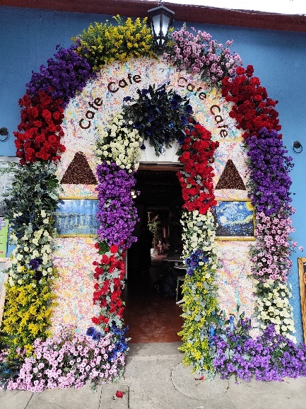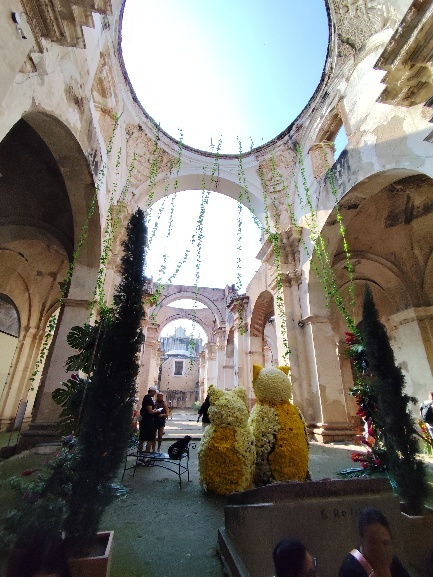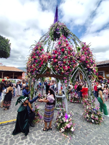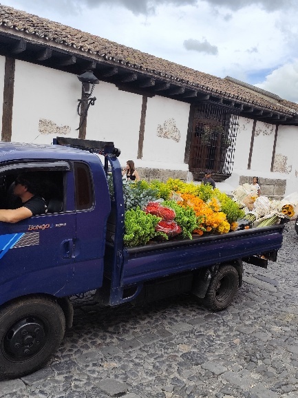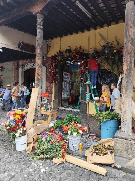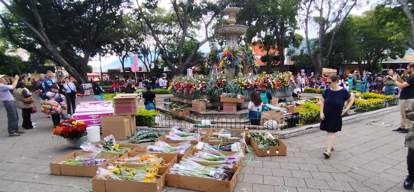 Weiter geht es zum Central Plaza, dem Hauptplatz Antiguas. Am Hauptplatz können wir beobachten, wie die Blumeninstallation für das Wochenende gefertigt werden. Unmengen von Blumen warten in Kisten darauf, in Gestecken präsentiert zu werden und LKWs bringen unaufhörlich Nachschub. Die Bereiche, die schon fertig gestellt sind, lassen erahnen, wie eindrucksvoll das Blumenfest werden wird.