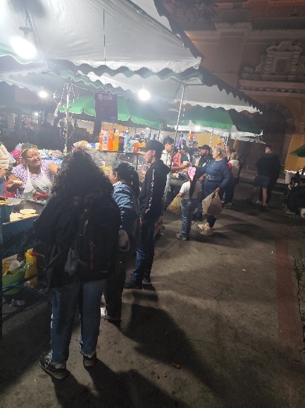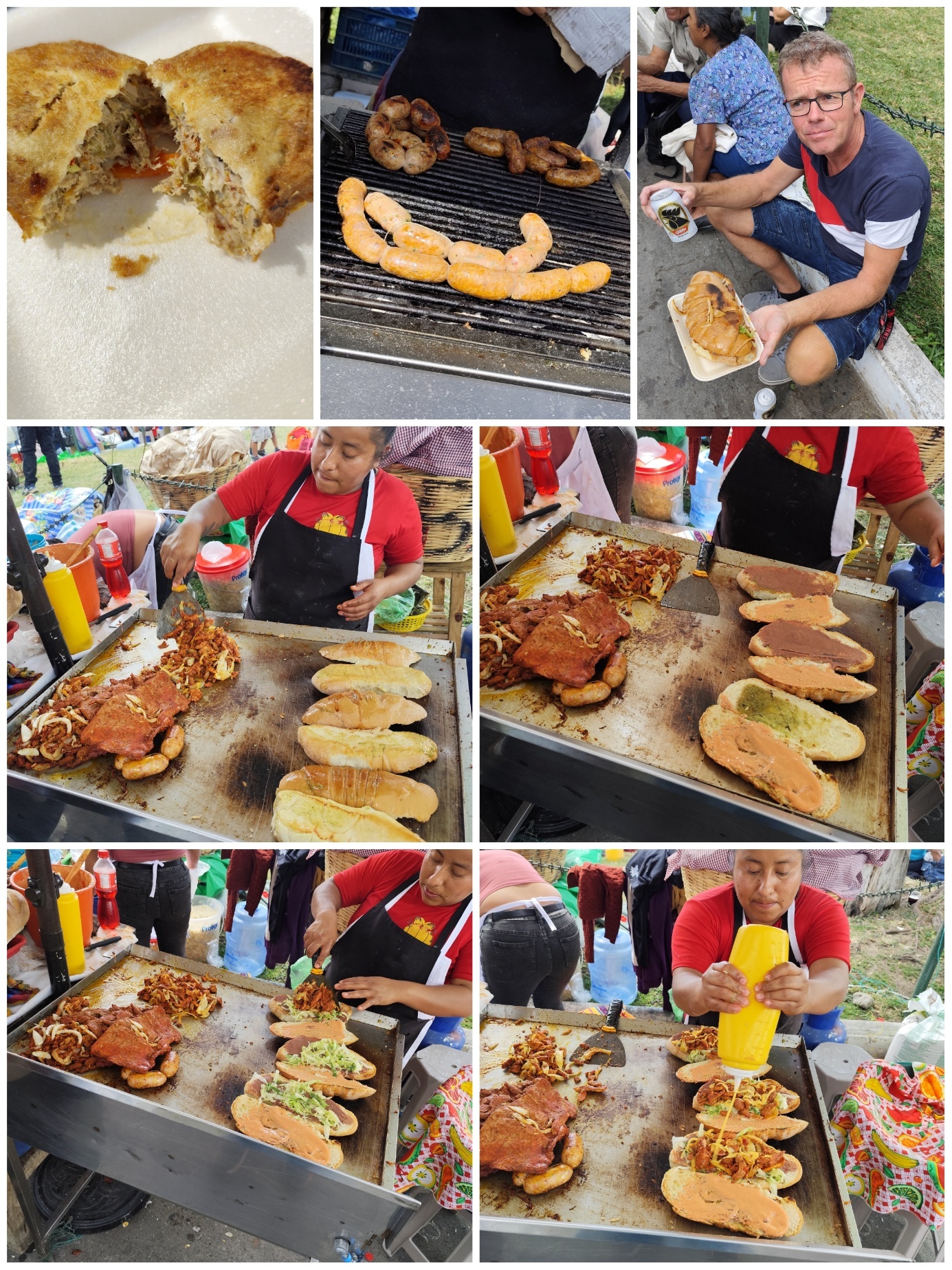 Der Food Street Bereich vor der La Merced Kirche ist heute genauso voll wie der Rest der Stadt und die Verkäufer kommen mit dem produzieren kaum nach. Für uns die Gelegenheit uns durch das Speiseangebot zu probieren. Heute kann nicht verdorbenes dabei sein, bei dem Durchsatz der hier herrscht. Unser erstes Sandwich besteht aus gegrilltem Brot, das mit verschiedenen Pasten, u.a. Bohnen und Guacamole bestrichen wird. Salat, Hähnchen, Zwiebeln und verschiedenen Soßen runden das Sandwich ab. Sehr lecker. Außerdem gibt es einen Hotdog, Chorizo, Hackfleischpastete und Schweinebraten.