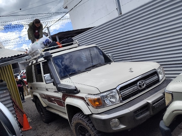 Am nächsten Morgen starten wir dann in einer größeren Gruppe unsere Tour. 2 Pickups werden gefüllt, der eine bis zum Rand, in unserem ist es bequem.