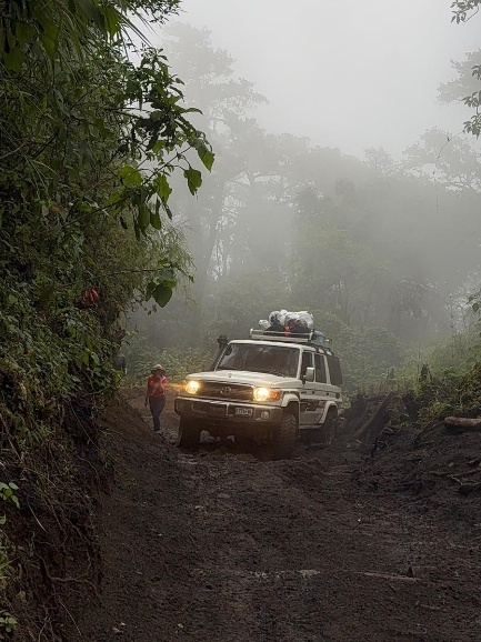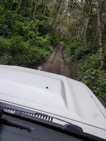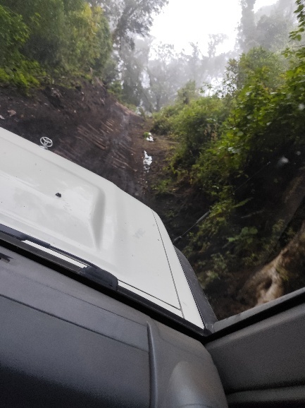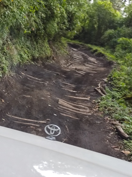 Nachdem wir am Vulkan eingecheckt haben, geht es weiter. Zunächst ist der Weg harmlos, nach kurzer Zeit werden aber sowohl die Schlaglöcher als auch die Steigung mehr. Es schaukelt ordentlich und wir müssen und gut festhalten. Der Weg ist in einigen Bereichen mit Baumstämmen befestigt und teilweise echt matschig. Der Geländewagen muss ordentlich arbeiten und immer wieder drehen die Reifen durch.