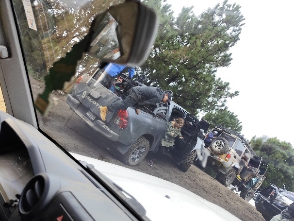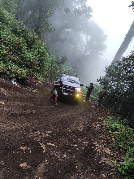 Und dann passiert es. Wir bleiben hängen. Nach mehreren Versuchen müssen wir aussteigen und gehen die Steigung bis zum nächsten Plateau zu Fuß. Zusammen mit 2 spanisch sprechenden Gästen werden die nachfolgenden Geländewagen gewarnt, rechtzeitig zu halten, damit sie die Stelle später mit Schwung überfahren können. Die Reifen unseres Wagens werden mit verschiedenen Hölzern und Zweigen unterlegt und nach etwa 15 min. schafft er die Steigung und wartet auf dem Plateau auf unsere Helfer. Diese müssen sich quasi vor den nachfolgenden Wagen retten, die stante pede folgen.