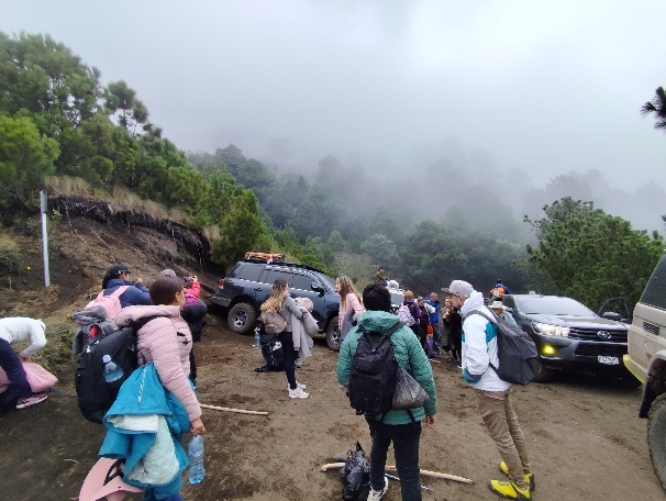 Zum Treffpunkt für die Tour zum Acatenango müssen wir ein bisschen länger laufen als geplant. Die Straßen in der Innenstadt sind wegen des Blumenfestes gesperrt. Nachdem alle Teilnehmer eingetroffen sind sitzen wir mit 7 Leuten im Auto, 2 müssen sich mit den Notsitzen im Kofferraum begnügen. Auf dem Weg zum Acatenango halten wir am Büro des Tourveranstalters. Hier erhalten wir Mützen, warme Jacken und Handschuhe. Für die Gäste, die die 2-Tagestour gebucht haben, werden auch noch Decken, Lebensmittel und Wasser aufgeladen.