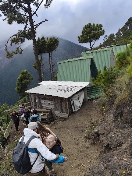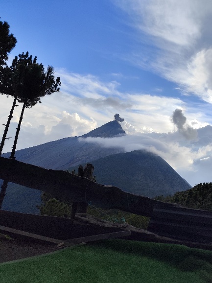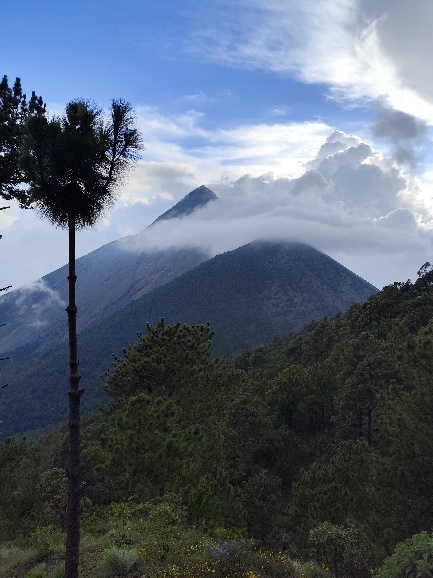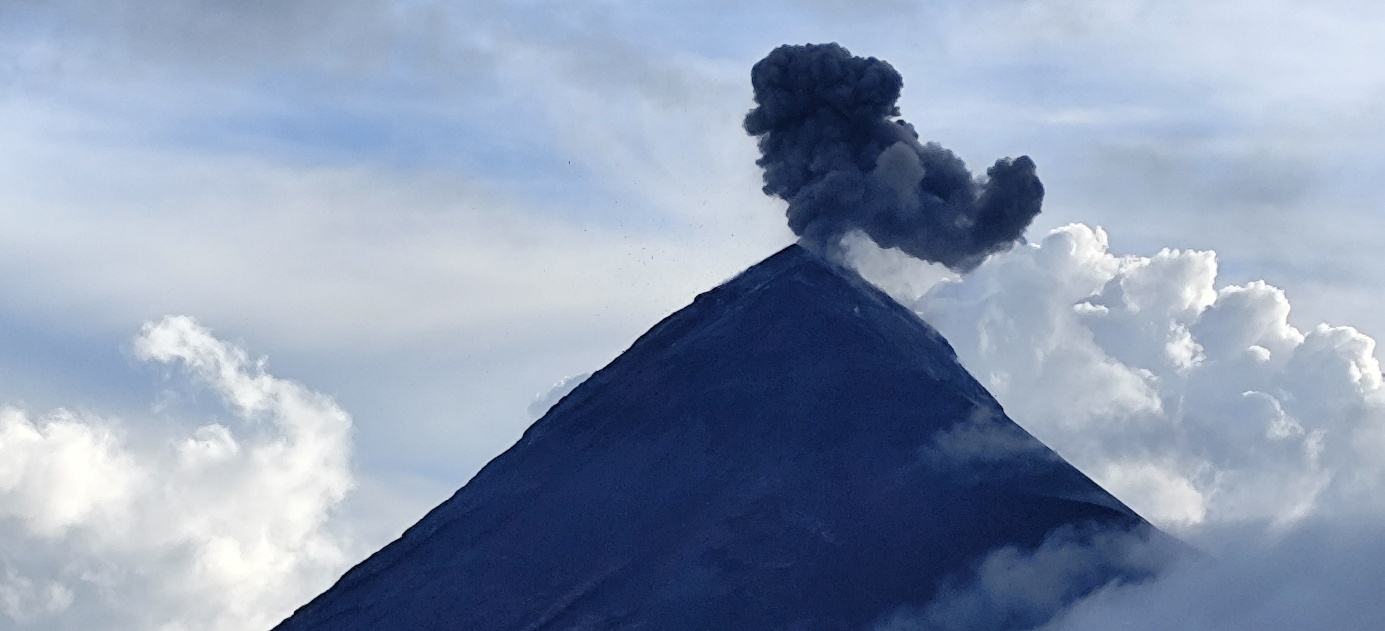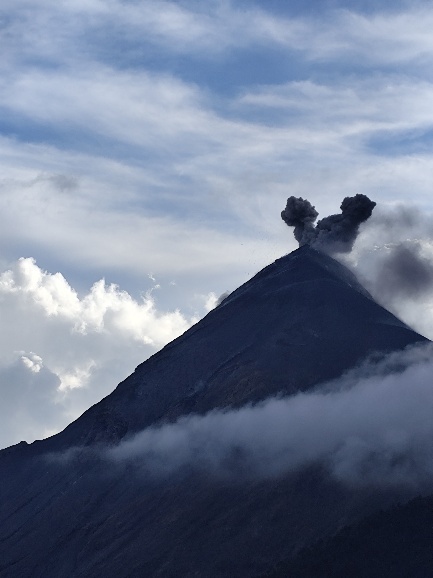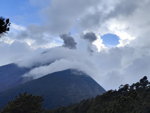 Noch liegt der Gipfel des Acatenango in den Wolken, diese lichten sich seit unserer Ankunft aber mehr und mehr. Immer wieder hören wir das Rumpeln und Knallen einer Eruption und sehen zwischen den Wolken nun auch schwarzen Rauch aufsteigen.
