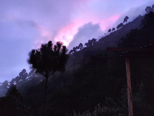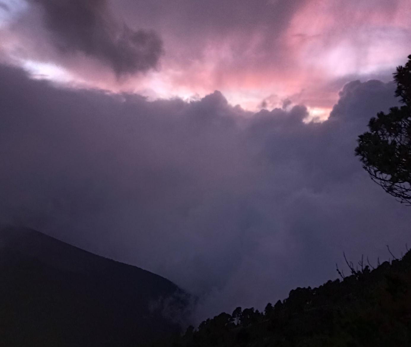 Leider ist uns das Glück nicht hold. Schon vor dem Sonnenuntergang zieht es sich wieder zu und reißt auch nicht wieder auf. Der Sonnenuntergang ist heute mal rosa und über den Wolken lässt sich noch mal schwarzer Rauch erkennen.