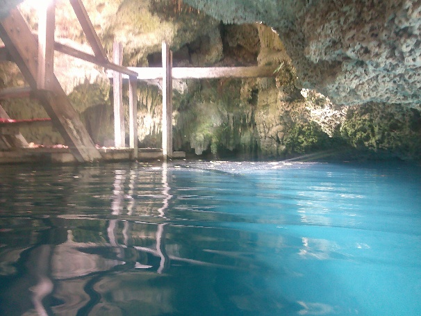Das obligatorische Duschen wird hier nicht kontrolliert und so gibt es einen leichten Film von Sonnenmilch auf dem sonst klaren Süßwasser. Das Schnorcheln macht Spaß und die Stalaktiten unter Wasser sind etwas Besonderes. Im Wasser können diese nicht wachsen. Nur in der Trockenzeit sinkt der Wasserspiegel soweit ab, dass ein Wachsen möglich ist. Bei normalem Wasserspiegel hängen sie dann ins Wasser hinein.