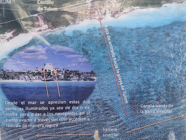 Der Küsten vorgelagert gibt es ein Riff und gegenüber des Castillos gibt es eine etwa 50m breite Durchfahrt für Schiffe. Über mit Feuer beleuchtete Öffnungen konnten die Maya ihre Boote in der Dunkelheit sicher durch das Riff fahren. Ein Richtfeuer aus dem 13. Jahrhundert, das uns richtig fasziniert.