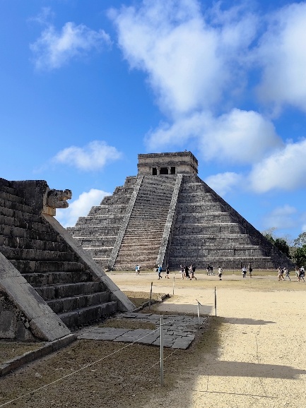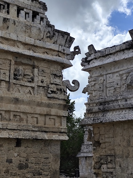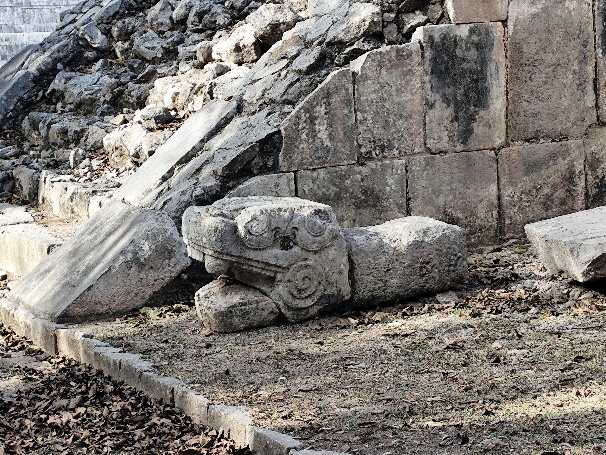 Auch dieses Castillo ist entsprechend der jahreszeitlichen Sonnenstände ausgerichtet. Hier aber so, dass bei Sommeranfang Sonne und Schatten so auf die Mauer der Haupttreppen fallen, dass es aussieht, als ob sich ein Schlangenkörper entlang der Trepper winden und am Fuß der Treppe im Schlangenkopf enden.