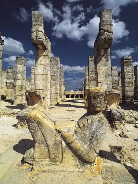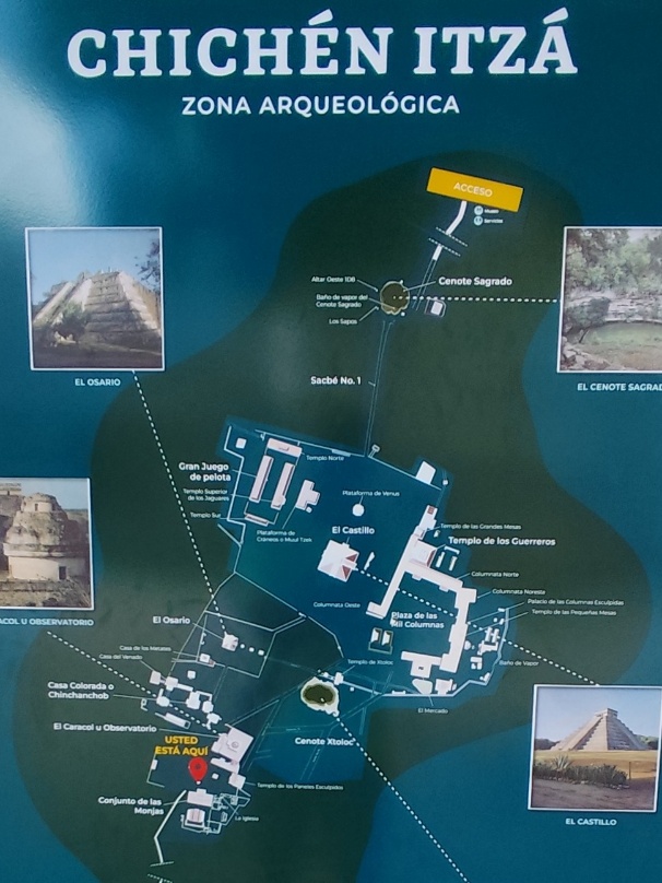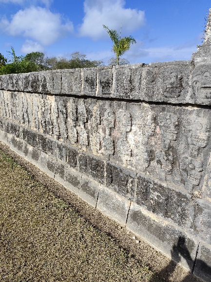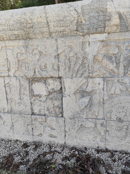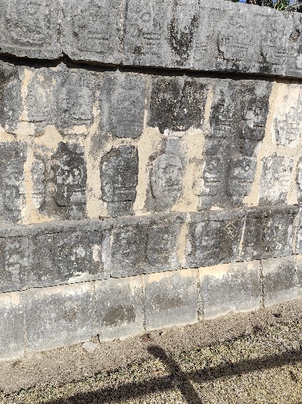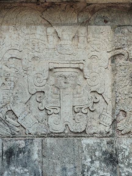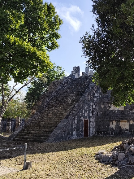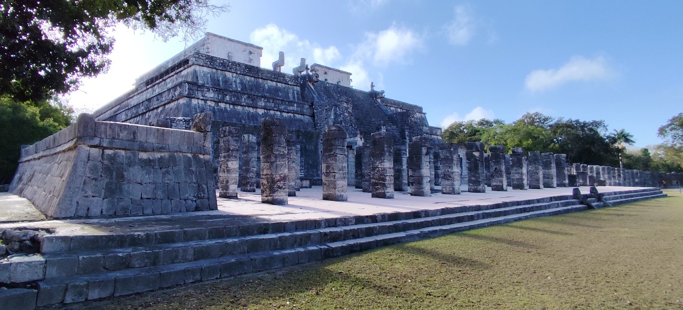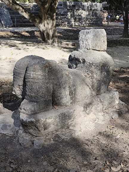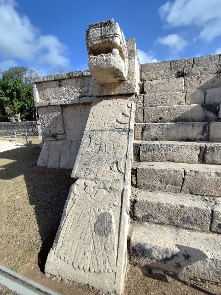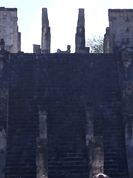 Östlich des Castillos liegt der Tempel der Krieger. Wie der Name schon sagt, wohnten hier die Krieger der Maya. Am oberen Ende der Treppe ist zwischen den Säulen ein Opferaltar zu sehen, der den Kriegern entsprechend gedient hat. Leider dürfen wir nicht mehr auf die Bauwerke klettern, aber unser Guide hat uns ein Foto des Altars mitgegeben.