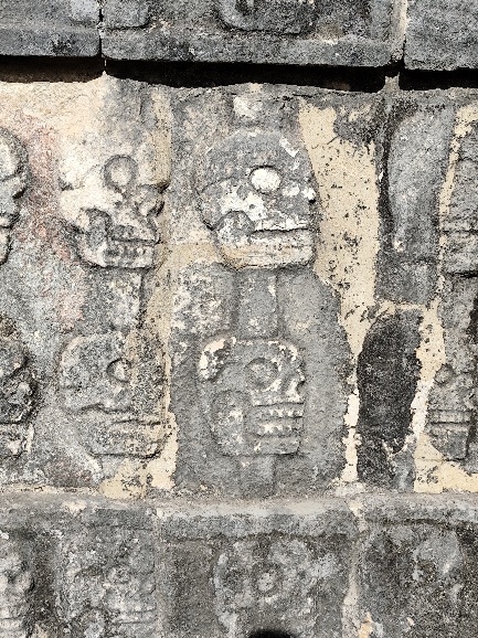 Reliefs an einer weiteren Plattform zeigen Totenköpfe.