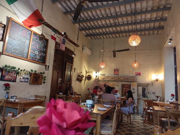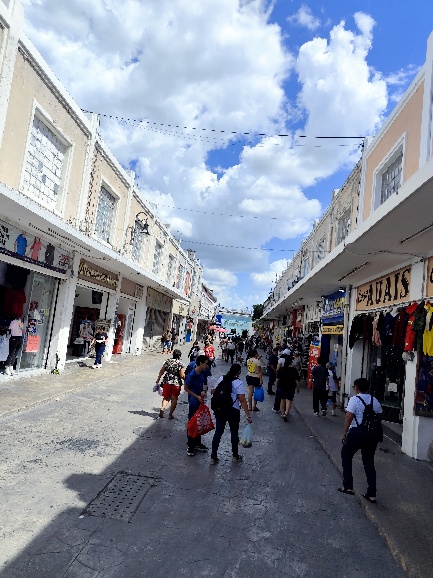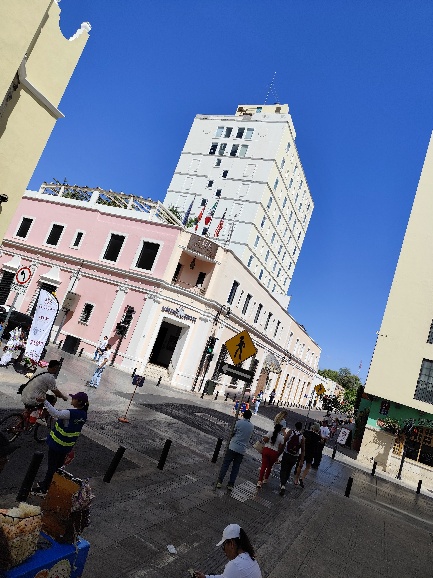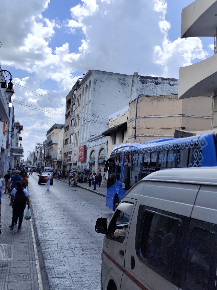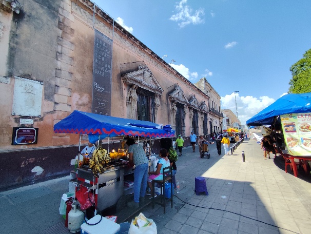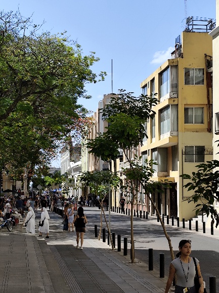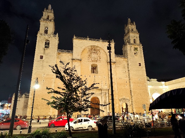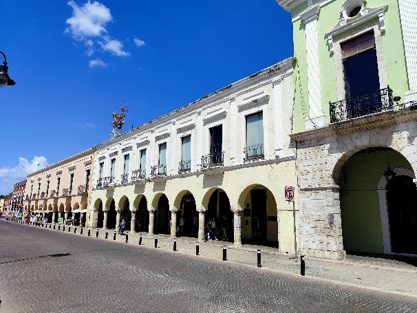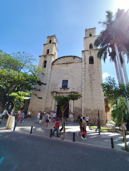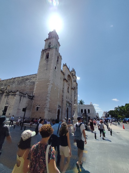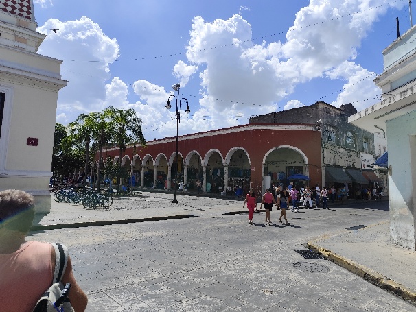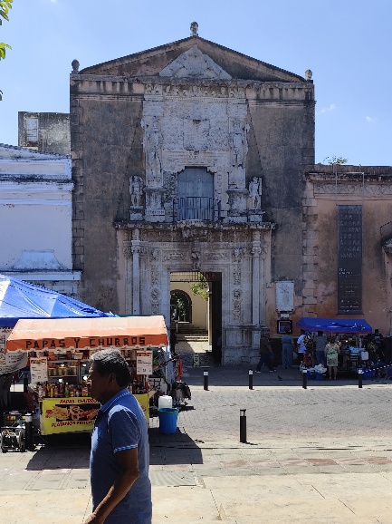 Wir laufen vorbei an schönen kolonialen Gebäuden und der Freien Universität Meridas. Bildung soll in Mexiko kostenlos sein, tatsächlich gibt es Studiengebühren, diese sind aber sehr gering. Die Grundschule ist verpflichtend, die Schulpflicht wird aber nicht kontrolliert. An der „Iglesia de Jesús de la Tercera Orden“ legen wir einen Stopp ein.