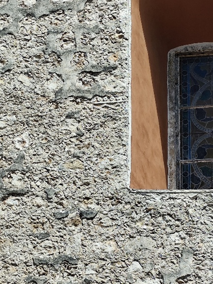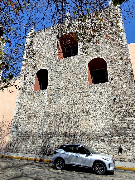 Hier zu sehen ist die seitliche Wand der Kirche. Wenn man genau hinschaut, entdeckt man neben dem Fenster einen Stein mit Mayaverzierung. Unser Guide zeigt uns noch einige andere Stellen. Tatsächlich wurde zum Bau der kolonialen Häuser und Kirchen die Mayatempel und Gebäude abgetragen und deren Steine zur Errichtung der neuen Bauwerke verwendet. Recycling ist keine Erfindung der Neuzeit, das gab es augenscheinlich schon immer.