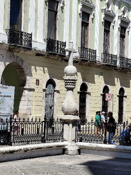 Wir erreichen den Hauptplatz von Merida, den Plaza Grande. Hier steht die Catedral de San Ildefonso. Die katholische Kirche wurde im 16. Jahrhundert in nüchterner Renaissancearchitektur erbaut und auch hier wurden Steine aus Mayatempeln verwendet. Unser Guide erklärt uns, dass das Kreuz an der Ecke der 60. und 61. Straße den Mittelpunkt der Stadt darstellt. Von hier aus werden die Entfernungsangaben nach Merida gemessen.