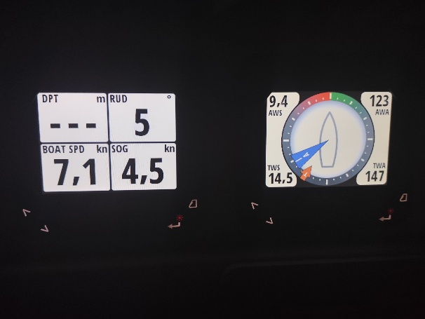 Genua und Motor bringen uns gute Fahrt durchs Wasser (Boatspeed) aber die Strömung ist diese Mal gegen an und so machen wir nur 4,5kn über Grund.