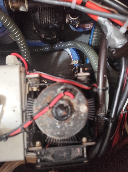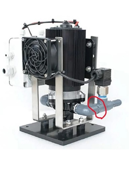 Eine weitere Baustelle ist die Pumpe unserer Entsalzungsanlage. Ein Blick von oben zeigt, dass es hier recht eng ist und man kleine Hände braucht um dort zu arbeiten. An der rot markierten Stelle gibt es eine Undichtigkeit, dass heißt wir müssen das Gewinde neu eindichten. Da aber darauf der Drucksensor sitzt - die Schwarze Box mit dem Kabel – können wir nicht so einfach die Verbindung lösen. Zunächst klemmen wir den Drucksensor ab. Dann können wir ihn ausbauen und das T-Stück lösen. Neu eingedichtet wird das T-Stück und der Sensor wieder montiert und angeschlossen. Ob es wirklich dicht ist, können wir erst in Belize testen, im Rio Dulce möchten wir den Watermaker wegen der Schadstoffe im Wasser nicht in Betrieb nehmen.