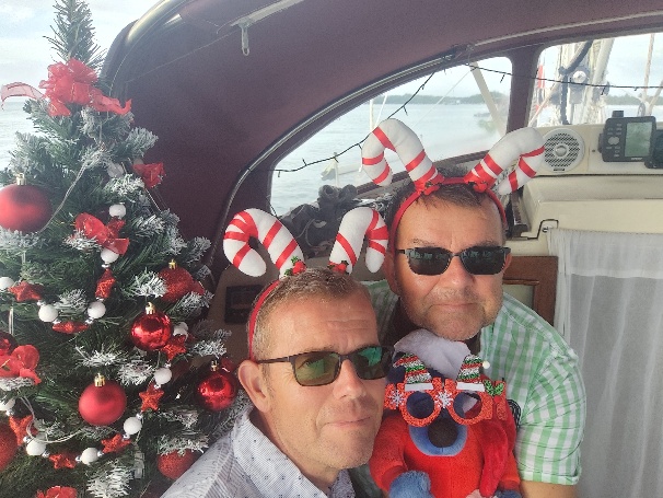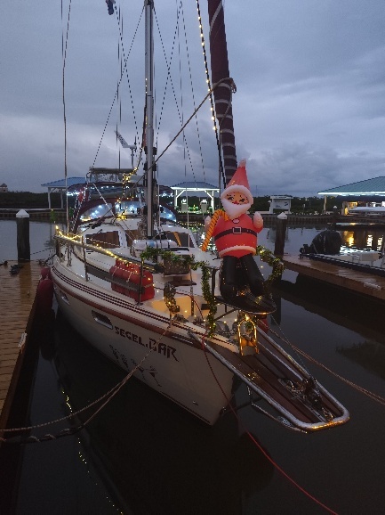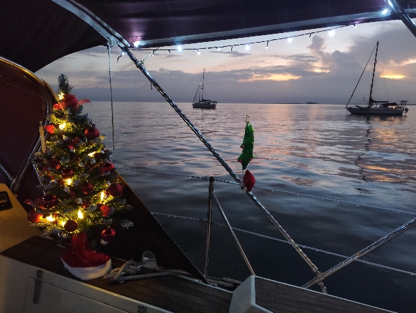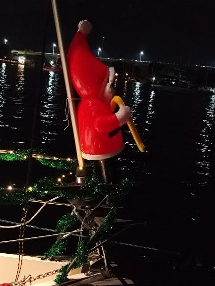 Unsere offizielle Abreisezeit ist Montag, der 15.12., um 6:30h. Da zu dem Zeitpunkt die Behörden noch geschlossen haben, können wir die Formalitäten schon 2 Tage vorher erledigen. Als Tom zurückkommt, hat auch die erste Weihnachtsdeko ihren Platz an Bord gefunden.