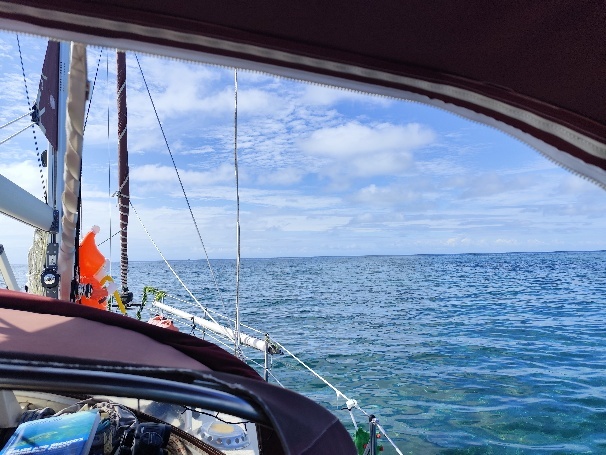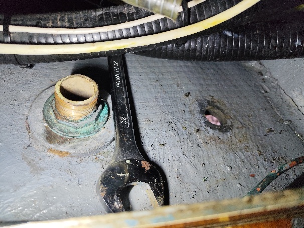 Tatsächlich ist der Bereich feucht. Der Borddurchlass war nicht mehr dicht und vermutlich Ursache für unser Salzwasser in der Bilge. Nachdem wir ihn gereinigt haben setzen wir ihn wieder mit neuer Dichtmasse ein und lassen ihn bis Sonntagmorgen trocknen.