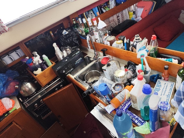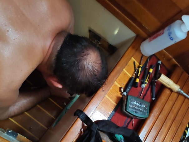 Unseren Watermaker hatten wir nach der Reparatur im Salzwasser getestet und für dicht befunden, trotzdem haben wir Salzwasser in der Bilge gefunden. Zunächst 300ml in 24 Std, zuletzt fast 2,5 l. Da nur die Backbordbilge mittschiffs betroffen ist, schränkt das die Verdächtigen ein. Nachdem wir alles ausgeschlossen haben fällt Tom nur noch der Kielbolzen unter dem Abwassertank ein. Der ist kaum zugänglich. Im Spülenschrank gibt es einen doppelten Boden, bis dahin räumen wir nun den Schrank leer. Über eine Revisionsöffnung können wir dann bis zum Rumpf schauen.