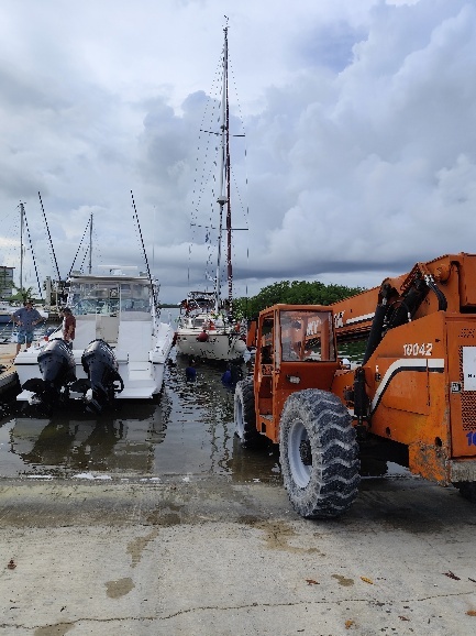 Mit dem Dockmaster bespricht Tom die Besonderheit unseres Schwingkiels und wie mit dem Slippwagen die Dicke aus dem Wasser geholt werden kann. Mit 2 Mitarbeitern im Wasser wird das Schiff richtig positioniert.