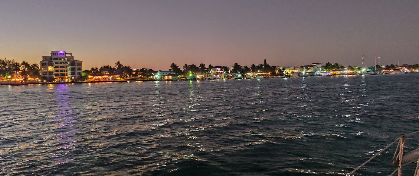 Leider währt unsere Freude nicht lange. Wieder einmal kommt uns das Wetter dazwischen. Es soll Westwind geben und hiergegen ist Cay Caulker nicht geschützt. Der Ankerplatz in San Pedero ist gegen West hervorragend geschützt, allerdings sollen die Ausflugsboote tagsüber für ordentlich Schwell sorgen. Das halten wir aus. Wir ändern unsere Pläne. Anstatt von Cay Caulker mit der Fähre zum Ausklarieren nach San Pedro zu fahren, gehen wir jetzt dort vor Anker. Am Mittwoch, den 04.02, legen wir nach San Pedro um. Die „Skyline“ ist am Abend ein schöner Anblick.