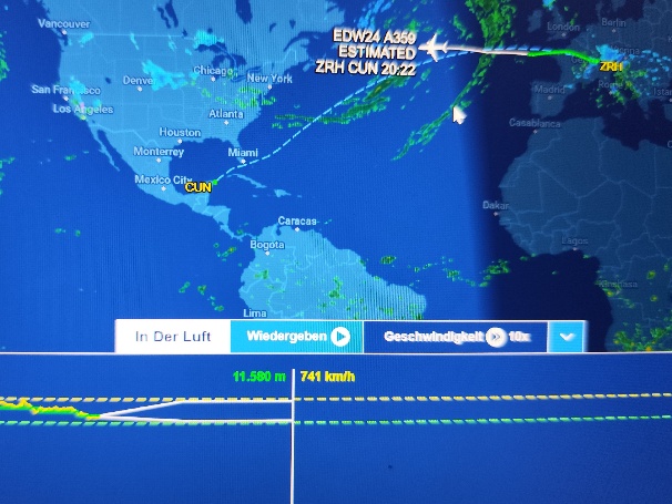 Schnell ist es Donnerstag, der 19.02., und unser Besuch startet mit 3 Stunden Verspätung aus Zürich. Die voraussichtliche Ankunftszeit variiert zwischen 20:20h und 21:40h. Die letzte Fähre von Cancun nach Isla Mujeres legt um 23:00 ab, wenn der Flieger tatsächlich erst um 21:40 landet, dann wird das ein ganz knappes Ding. Die Fahrtzeit zwischen Flughafen und Fähranleger beträgt 45 min.