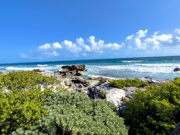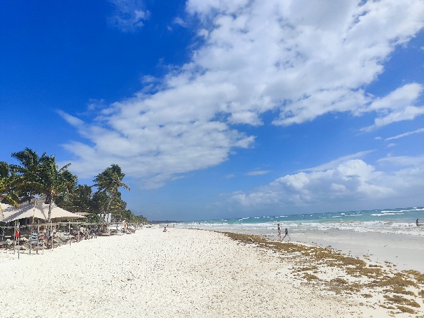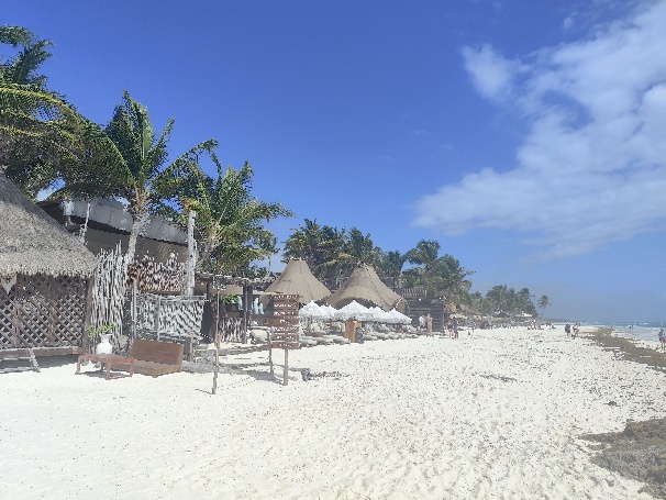 Tulum ist auch für seine Strände berühmt. Laut Google Maps kommt man zum berühmtesten Strand „Playa Paraiso“ über eine Straße, die etwa 5 Minuten mit dem Auto entfernt ist. Aber hier gibt es Zugangskontrollen und mit den PKW kommt man nur nach Reservierung weiter. Hier stehen allerdings die gleichen Busse, wie sie auch bei Tulum standen, und nach einigen Nachfragen haben wir es verstanden. Für den Bus und den Zugang benötigt man die Armbänder, die wir heute schon bezahlt haben, der Tom aber schon auf dem Parkplatz entsorgt hat. Damit kommt man zum Strand. An der Einfahrt, an der wir grade stehen gibt es aber keine Parkmöglichkeiten. Also geht es zurück zum alten Parkplatz, Tom rettet seine Armbändchen und wir benutzen den gleichen Eingang wie heute Morgen. Mittlerweile steht eine lange Schlange und wartet auf die Transportbusse. Da die meisten vermutlich an der ersten Station (600m) bei den Ruinen aussteigen werden laufen wir zu Fuß dorthin vor. Für unseren Besuch scheint es einem Marsch durch die Wüste gleichzukommen. Das Leiden Christi muss dagegen ein Wellness Urlaub gewesen sein, zumindest dem Gesicht zu Folge. Der Plan geht auf und den größten Teil der Strecke legen wir motorisiert zurück. Die einen planschen im Wasser, die anderen kühlen sich bei einer Cola ab. Der Strand ist wirklich schön und vor allem sauber.