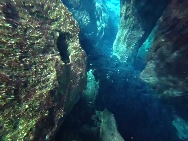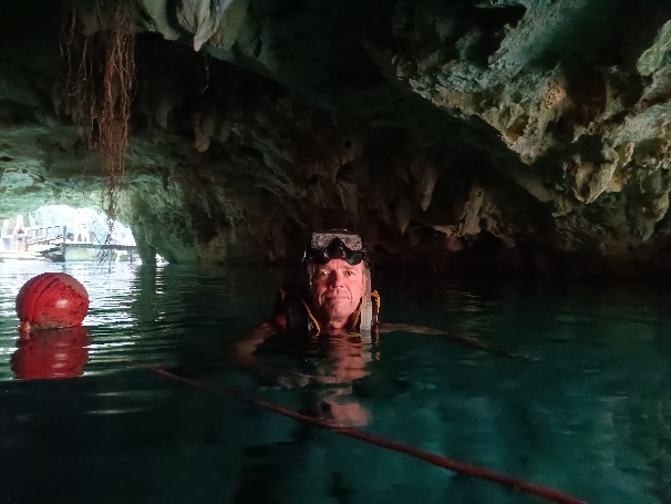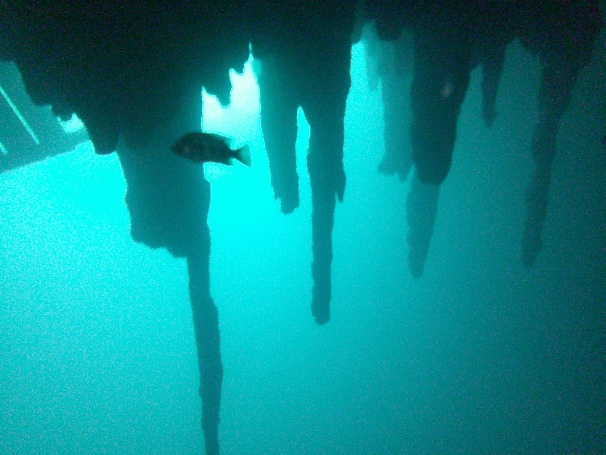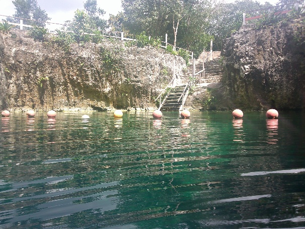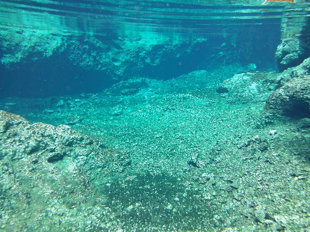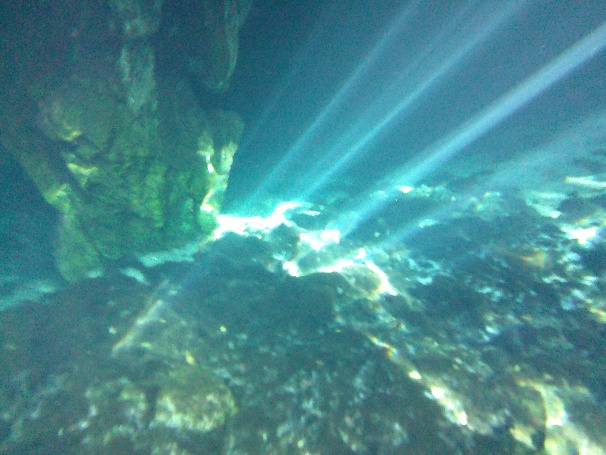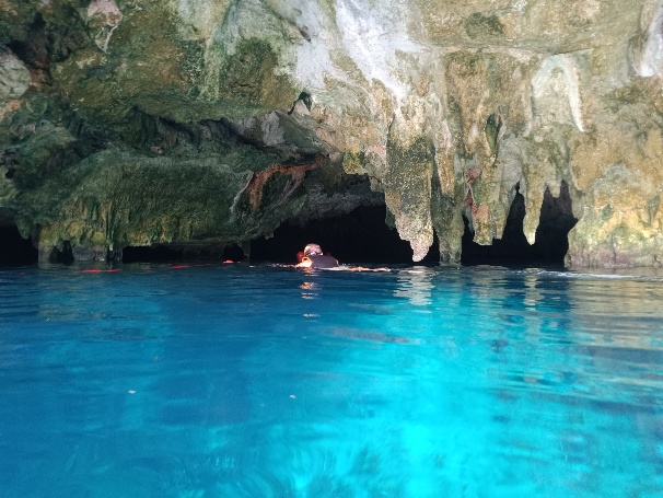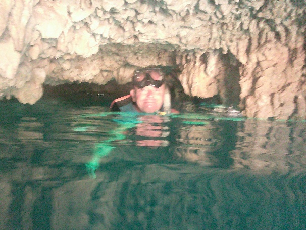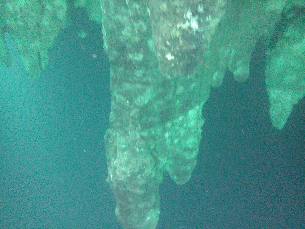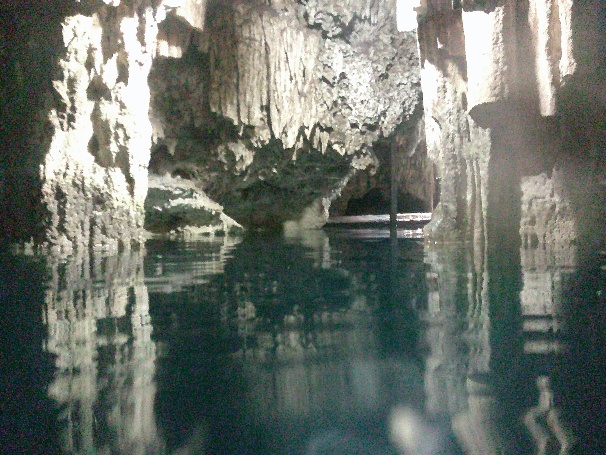 Das obligatorische Duschen wird hier nicht kontrolliert und so gibt es einen leichten Film von Sonnenmilch auf dem sonst klaren Süßwasser. Das Schnorcheln macht Spaß und die Stalaktiten unter Wasser sind etwas Besonderes. Im Wasser können diese nicht wachsen. Nur in der Trockenzeit sinkt der Wasserspiegel soweit ab, dass ein Wachsen möglich ist. Bei normalem Wasserspiegel hängen sie dann ins Wasser hinein.