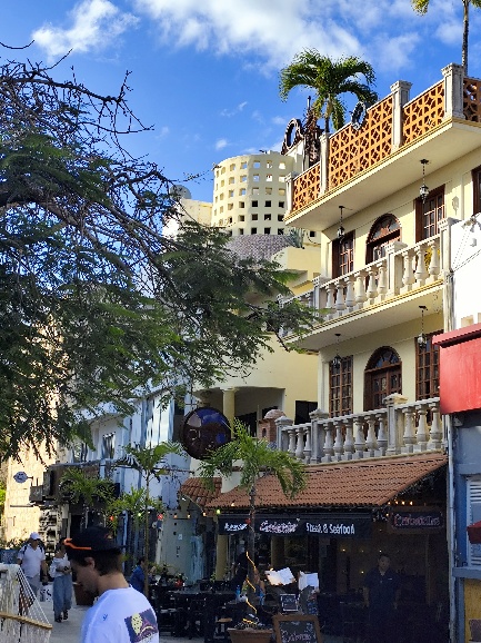 …. und suchen uns einen Parkplatz. Entlang der Küste gibt es noch einige Hotels, Shops und Restaurants. Wir schlendern die Straße entlang in die eine Richtung und am Strand zurück.