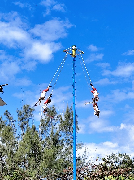 Über den modernen Leuchtturm geht es zurück zum Auto. Am Eingang zur Mayastätte hat sich ein Touristenzentrum mit Shops und Restaurants gebildet. Als wir zurückkommen, wird grade eine Darbietung präsentiert, bei der sich Männer zunächst am Seil in den Turm ziehen lassen und dann wieder herunter. Dabei drehen sie sich ständig. Uns wird ganz schwindelig bei der Vorstellung da oben zu hängen.