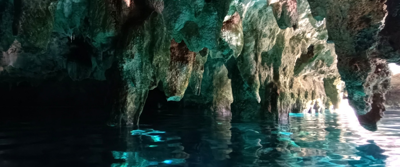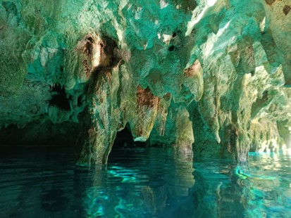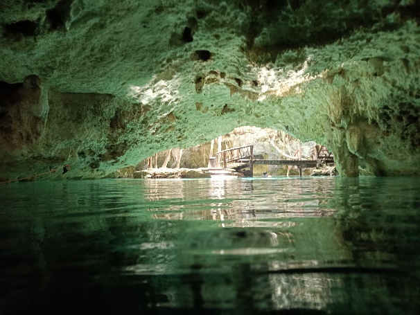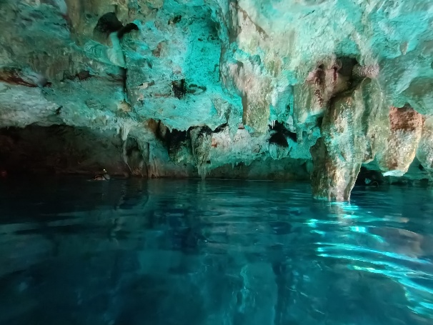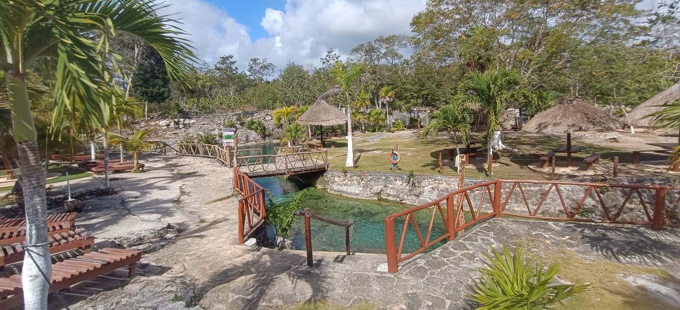 Am Montag, den 23.02., wollen wir unsere Rundreise über die Halbinsel Yucatan beginnen. Überschattet wird das Ganze vom gewaltsamen Tod eines Drogenclanchefs, wodurch es an der Westküste Mexikos einige Unruhen gegeben hat. Wir befinden uns an der Ostküste, also fast 2000 km entfernt. Wir fahren los. Mit dem Taxi zur Fähre und dann weiter mit Uber zum Flughafen. Hier holen wir unseren Leihwagen ab. Dann geht es zu den „Cenotes Siete Bocas“, den Cenoten der 7 Münder. Cenoten sind Höhlen mit Grundwasserzugang, die, meist durch Einsturz der Höhlendecke, als großes Kalksteinloch vorliegt und das mit Süßwasser gefüllt ist. Es kann als Brunnen dienen kann. Hier gibt es insgesamt 7 Cenoten, von denen 5 so miteinander verbunden sind, dass man zwischen ihnen hin- und her schwimmen kann. 2 können nur durch tauchen erkundet werden.