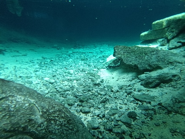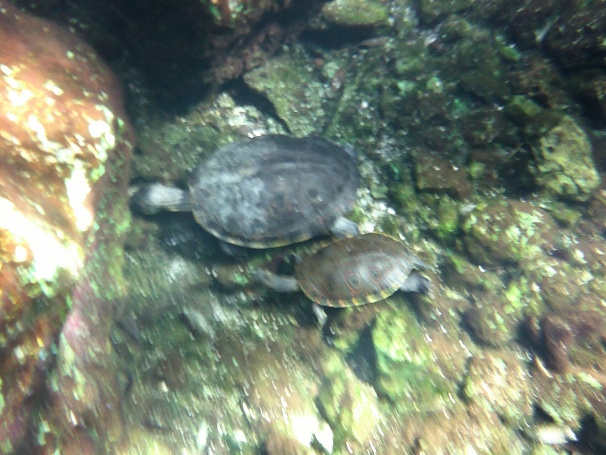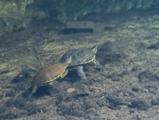 Und in dieser Cenote gibt es auch Schildköten, die kreuz und quer durchs Wasser schwimmen.